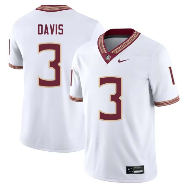 • Men's Kam Davis White Florida State Seminoles #3 College Football University Jersey