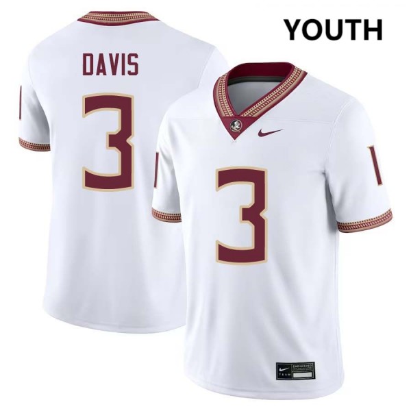 • Youth Kam Davis White Florida State Seminoles #3 College Football 2025 Jerseys